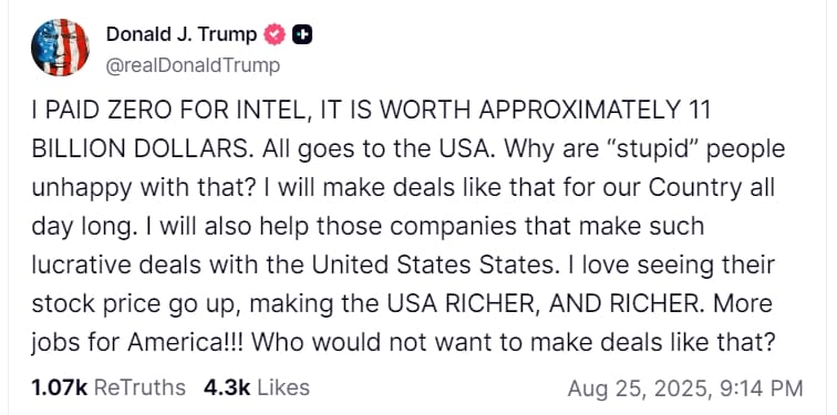Il presidente Donald Trump ha celebrato su Truth Social l’acquisizione governativa del 10% di Intel, dal valore stimato di circa 11 miliardi di dollari, definendola un’operazione che porterà risorse e posti di lavoro agli Stati Uniti e annunciando l’intenzione di replicare l’iniziativa con altre aziende private. La Casa Bianca ha spiegato che la mossa rientra in una strategia più ampia volta alla creazione di un fondo sovrano americano, sostenuto anche da fondi del Chips Act. Oltre alle azioni, Washington ha ottenuto un’opzione per salire fino al 15% in caso di cambiamenti nella governance di Intel. Pur assicurando che il governo non interferirà nella gestione, il consigliere economico Kevin Hassett ha sottolineato che si tratta di un passo verso il rafforzamento industriale nazionale, in linea con dazi e politiche di reshoring. L’operazione, giudicata senza precedenti per portata e contesto, suscita dibattito: secondo alcuni esperti si tratta di un’ingerenza forte in una compagnia solida, diversa dai salvataggi d’emergenza del 2008, ma che potrebbe inaugurare un nuovo modello di intervento statale nell’economia americana.